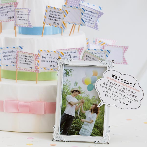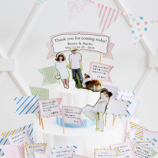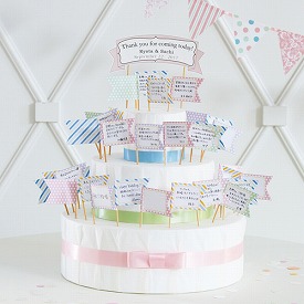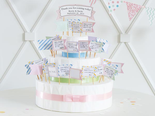 ゲストがフラッグに寄せ書きをし、ケーキをデコレーションするように作り上げていく世界に一つだけのメッセージケーキ。色とりどりの言葉たちが、会場を華やかに彩っていきます。 本体1個 フラッグ50枚 セットアップ:φ30×H38cm ネームプレート  |
