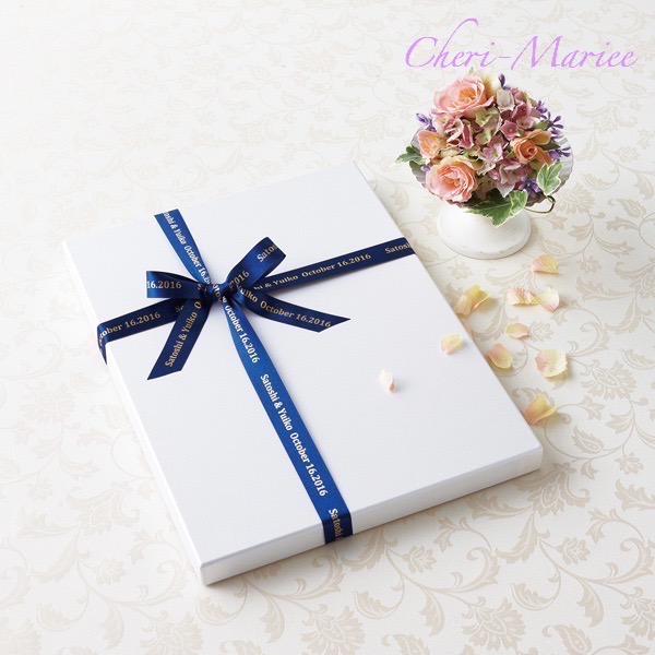 おふたりのお名前と挙式日をプリントした5色のリボン。プレゼントや会場の飾りとして使ったり、ブーケプルズや誓いの演出に使ったりと、様々なシーンでおふたりらしさを際立たせます。 サテンリボン1本:18mm 長さ20M リボンの色は、レッド・ピンク・ホワイト・ライトブルー・ネイビーからお選びください。 ※ご注文後の文字の変更・キャンセルはお受けしかねます。  |