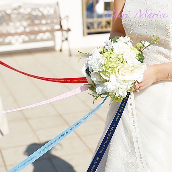 おふたりのお名前と挙式日をプリントした5色のリボン。プレゼントや会場の飾りとして使ったり、