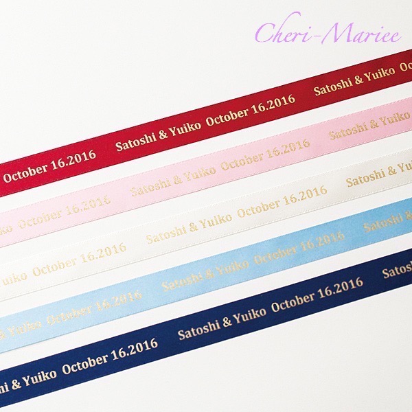 おふたりのお名前と挙式日をプリントした5色のリボン。プレゼントや会場の飾りとして使ったり、ブーケプルズや誓いの演出に使ったりと、様々なシーンでおふたりらしさを際立たせます。 リボンの色は、レッド・ピンク・ホワイト・ライトブルー・ネイビーからお選びください。 ◎サテンリボン1本:18mm 長さ10M  ※ご注文後の文字の変更・キャンセルはお受けしかねます。  |