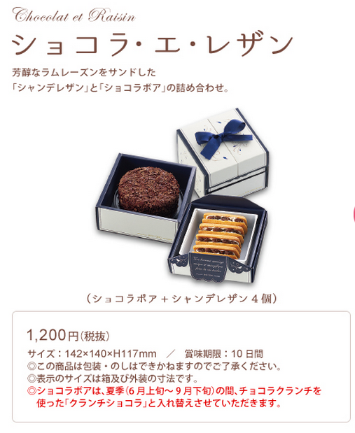 芳醇なレーズンをサンドした「シャンデレザン」と「ショコラボア」の詰め合わせです。 パッケージサイズ:奥行き142mm×横幅140mm×高さ117mm |