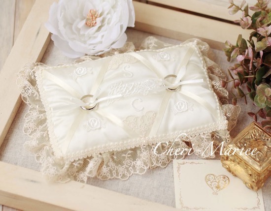 スクエア型のクッションがレースとリボンが付いたクラシカルなタイプのリングピローです。