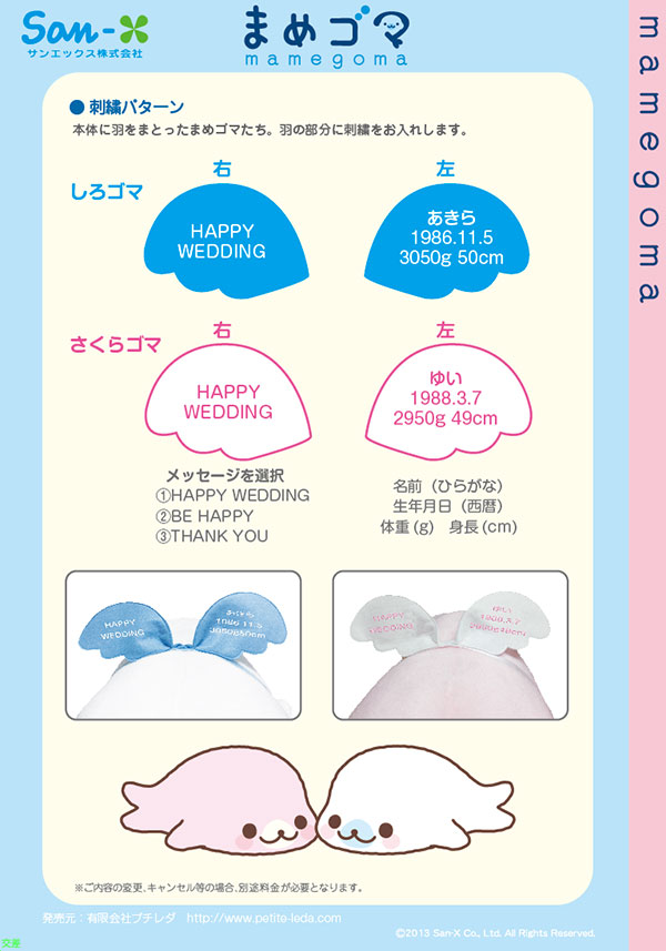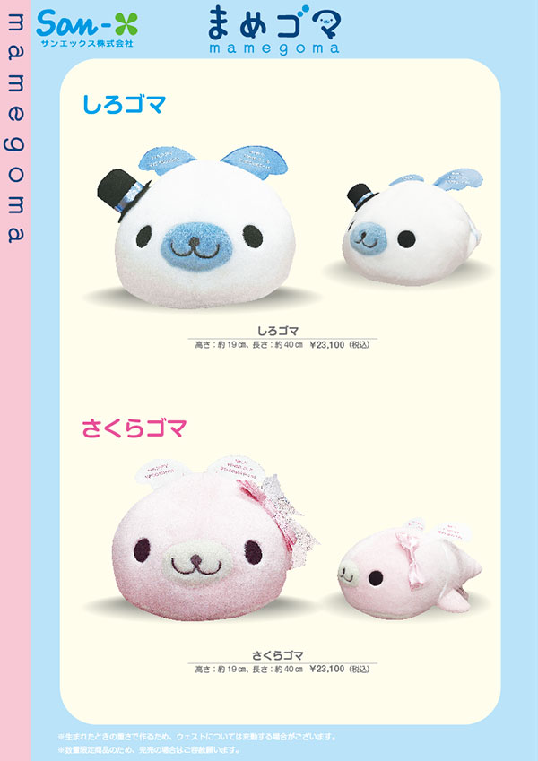 | 内容 | 「つぶらな瞳とコロンとしたフォルムのまめゴマは、ちょっと赤ちゃんに似ているかも…♪」かわいい天使の羽をつけた「しろゴマ」と「さくらゴマ」が、披露宴の感動をより一層盛り上げる演出アイテムとして登場です。あなたが生まれた時の体重で作る可愛いウェイトドールです。 サイズ ・高さ:約19cm、長さ:約40cm