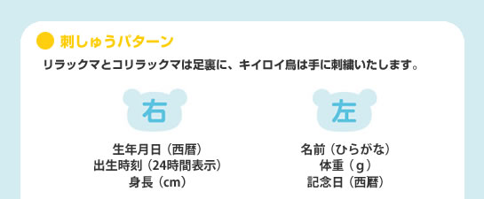 | 足裏刺繍 | ・右足(生年月日/出生時刻/身長) ・左足(名前/体重/記念日)  |